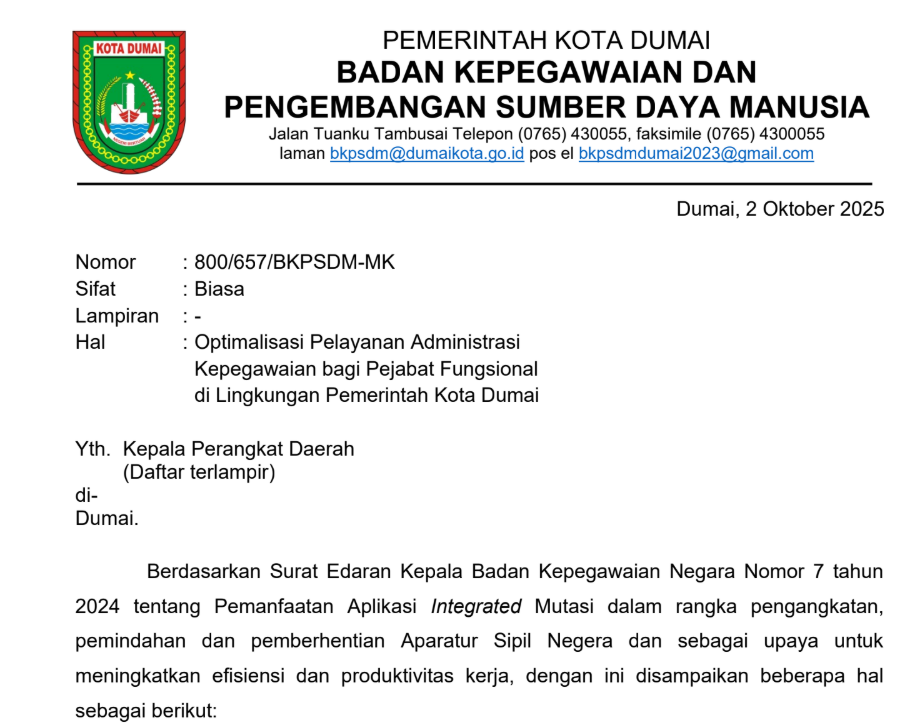 Optimalisasi Pelayanan Administrasi Kepegawaian bagi Pejabat Fungsional di Lingkungan Pemerintah Kota Dumai